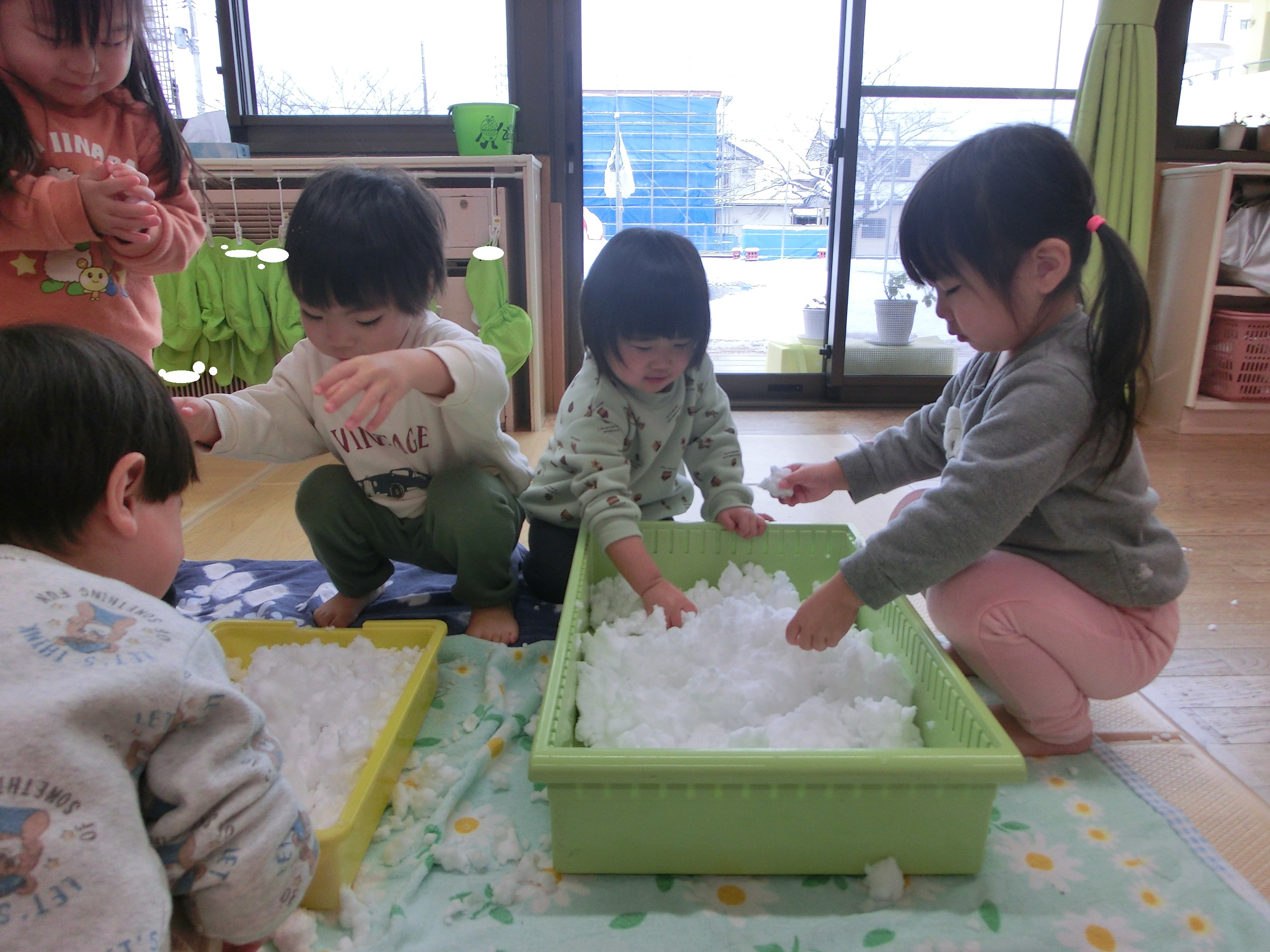 園庭が雪で真っ白になった日、子ども達は「ゆき!」「お家も真っ白だった!」と嬉しそうな表情を見せてくれました。保育園でもお部屋の中に雪を持ってきて、感触あそびを楽しみました♪