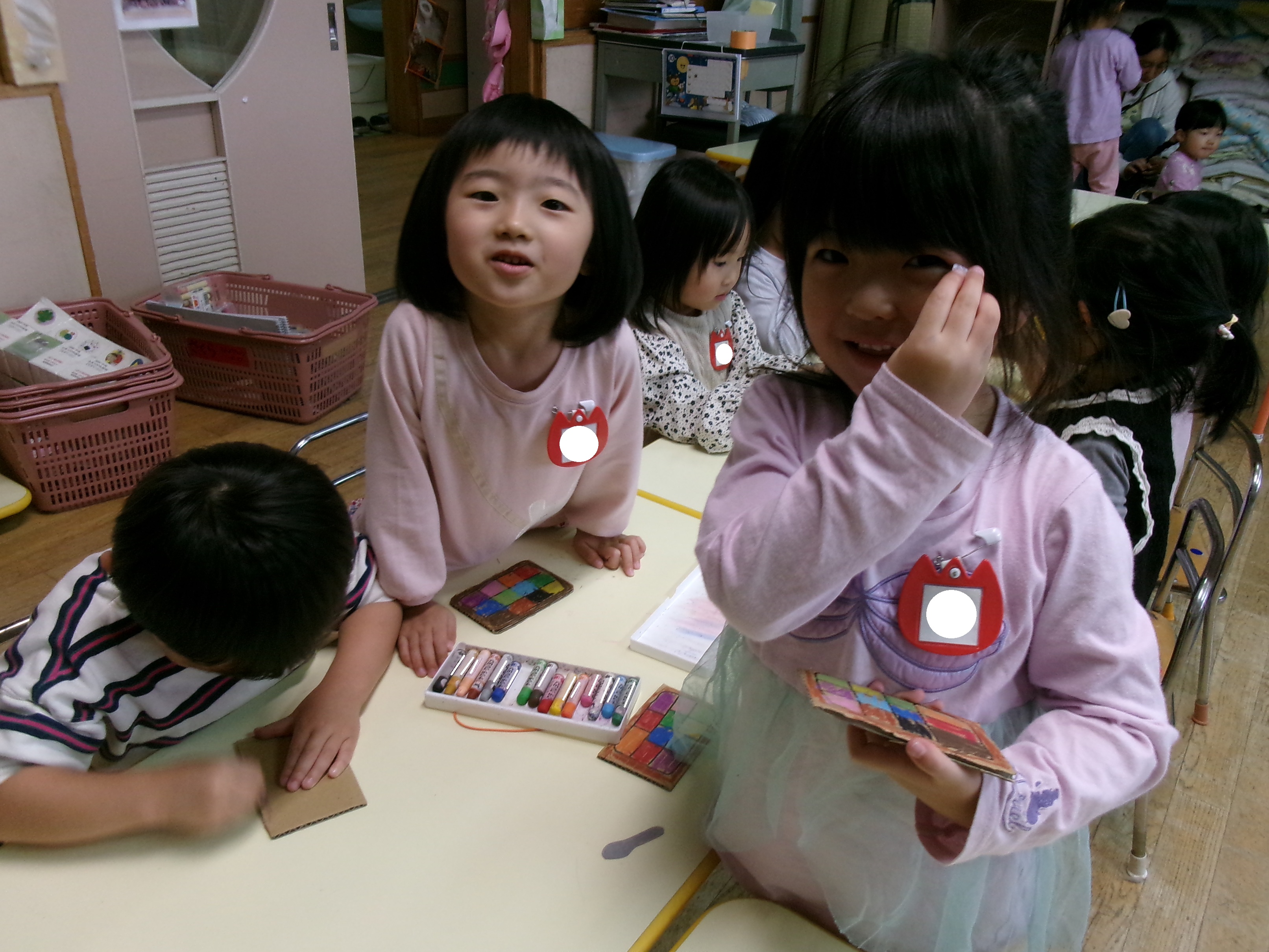 「今日はむらさきのきぶん〜」と自分で作ったカラフルなパレットから、まぶたやほっぺ、くちびるに色をぬって楽しむ3歳児さんでした!