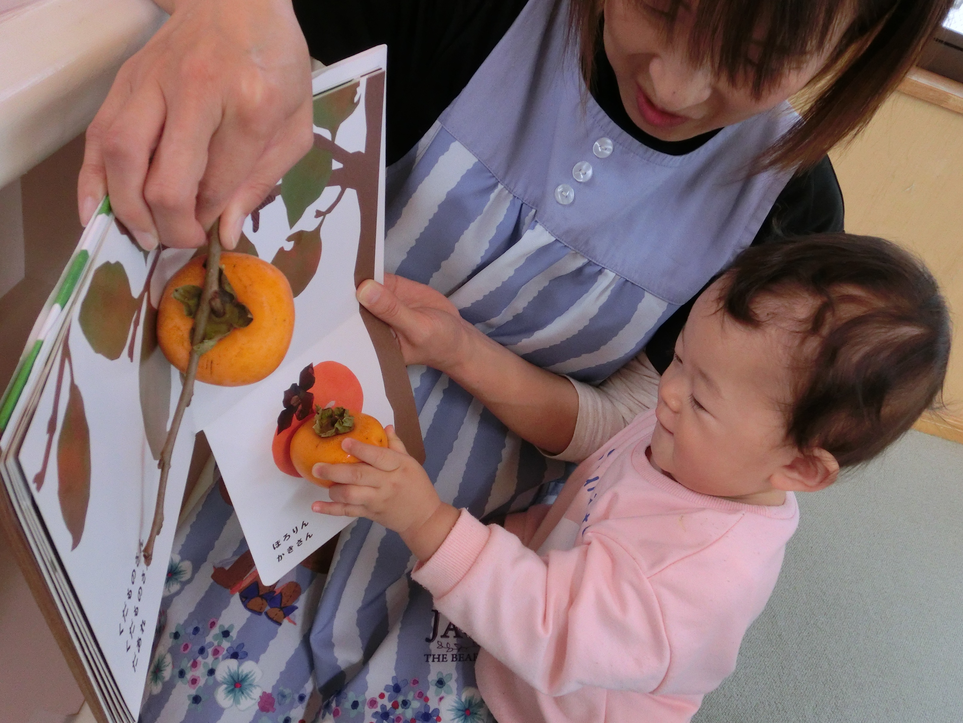 最近のお気に入りの『くだものさん』の絵本。今回は、本物の柿とのコラボレーション。絵本のイラストと本物の柿を合わせて、『一緒だね』と先生と嬉しそうに微笑むお友だち。読書の秋はもちろん!触って、匂いを嗅いで、五感をたっぷり使い、味覚の秋も楽しんでいます♪