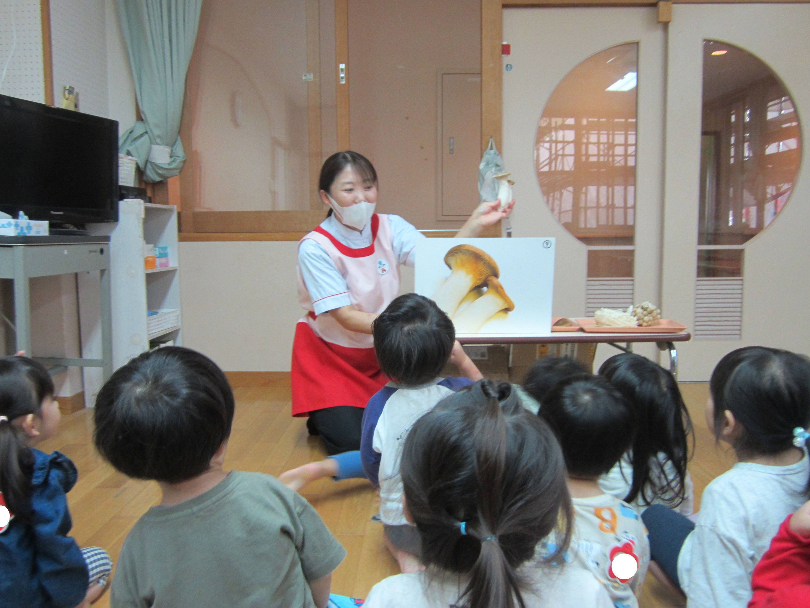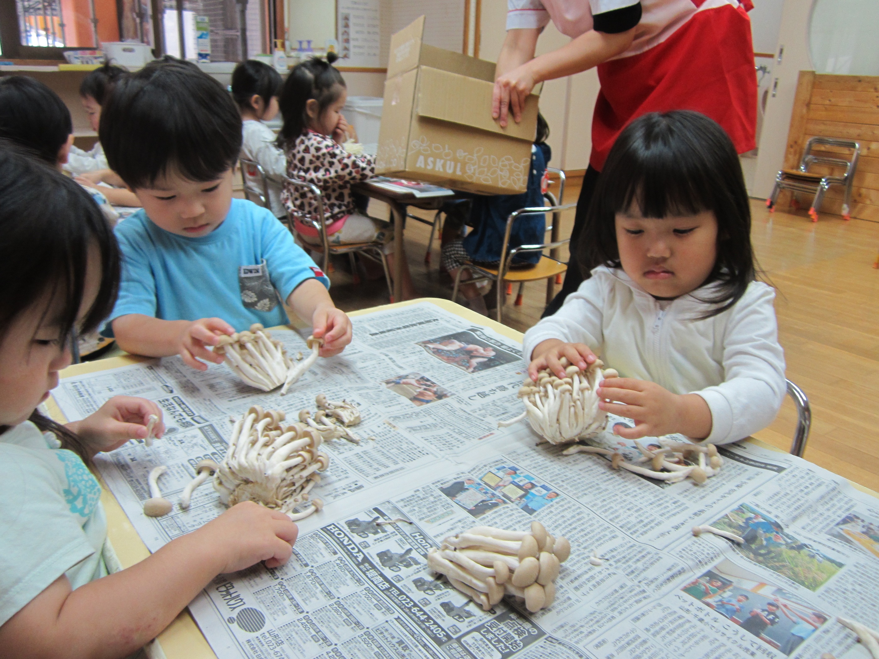 給食の先生に来てもらい、きのこの名前などを教えていただきました。その後、本物のきのこを触り、割くお手伝いをしました。